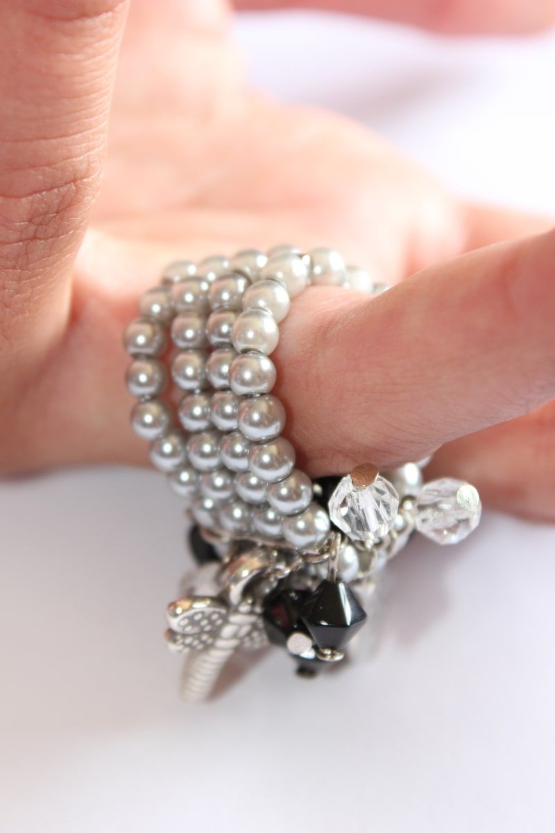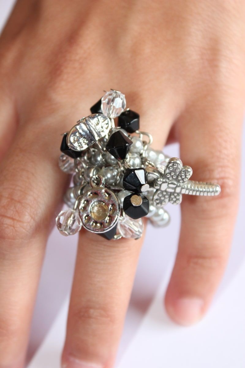 Anillo de bisutería elástico con bolitas en color plateado y con abalorios colgantes
