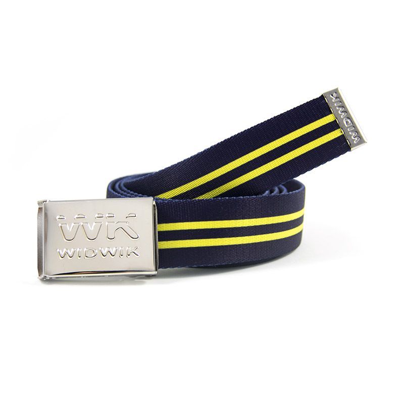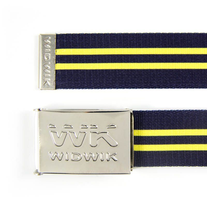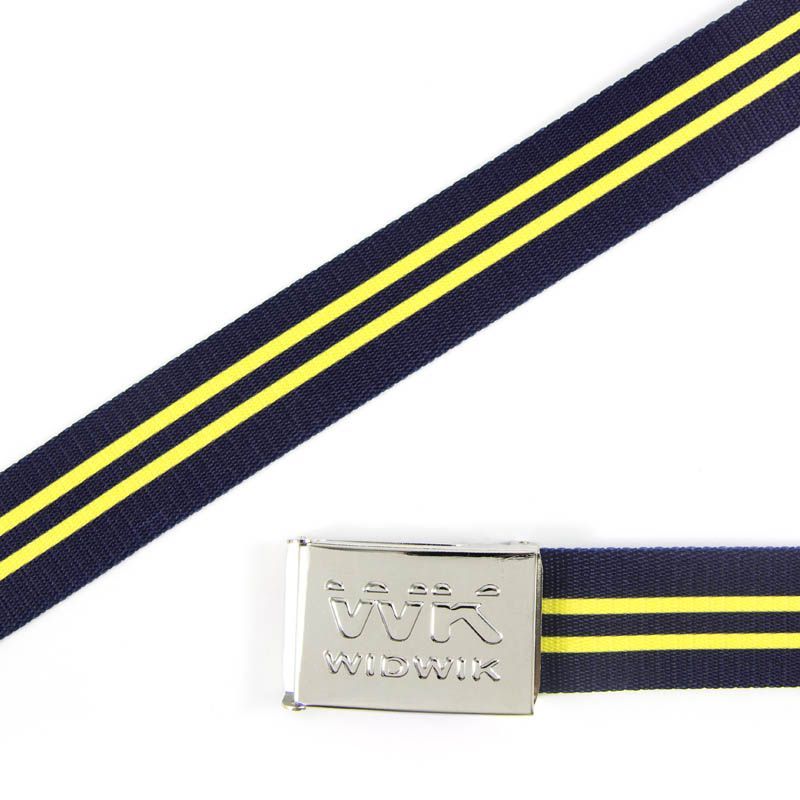 Este cinto de fondo azul atravesado con dos líneas horizontales amarillas define la elegancia. El cinto exclusivo Widwik WK te hará sentir como una estrella sin descuidar la estética. De talante clásico pero con un toque de color para tu look más formal.