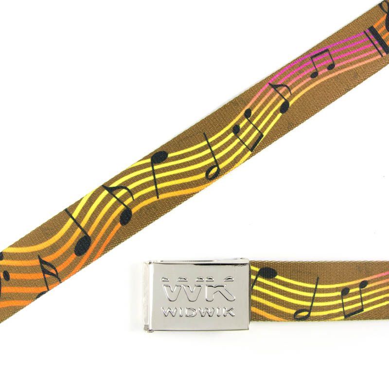 Cinto de color marrón con tonos anaranjados, amarillos, y con notas musicales.