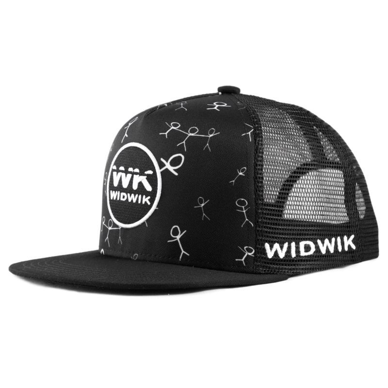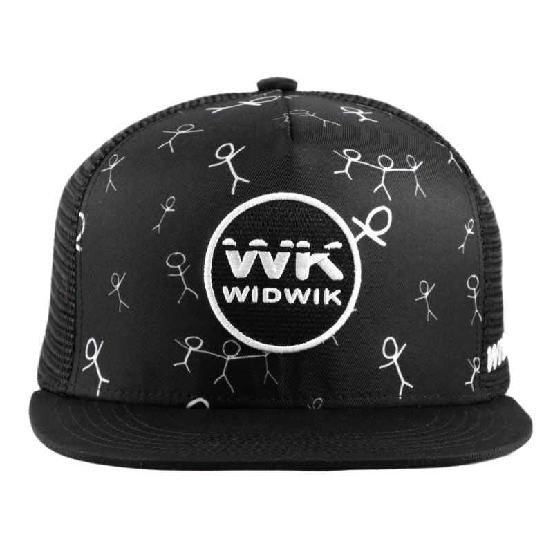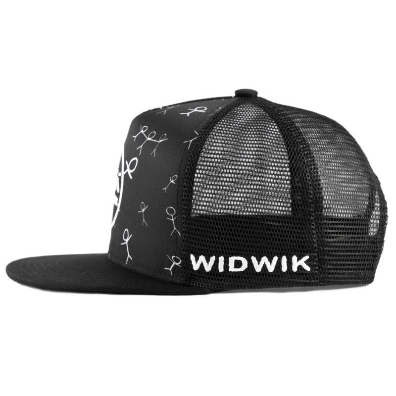 Gorra negra con estampado de monigotes y con parche cosido en la frontal de la marca Widwik.