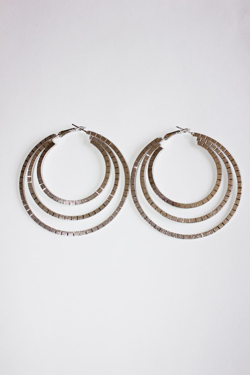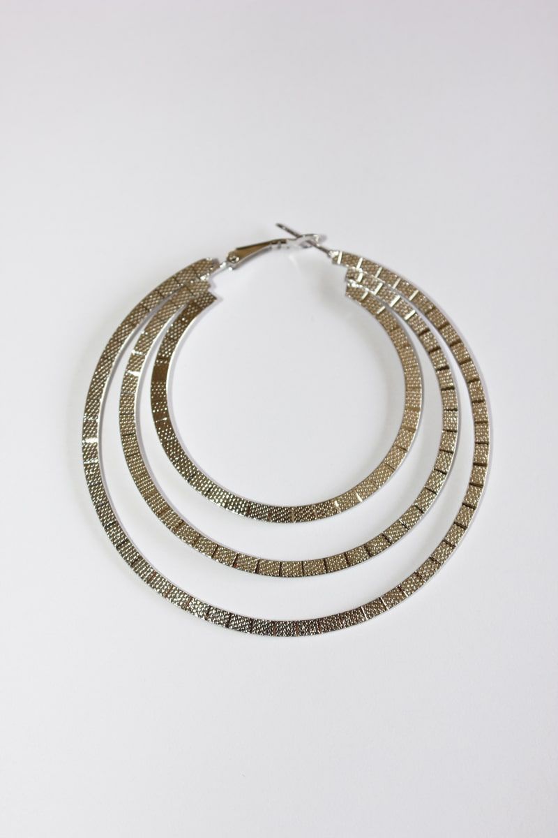 Pendientes de mujer, triple aro plano en color plateado con cierre de mosquetón. Largo 7 cm aproximadamente.