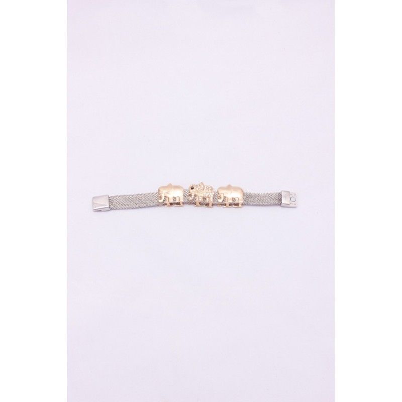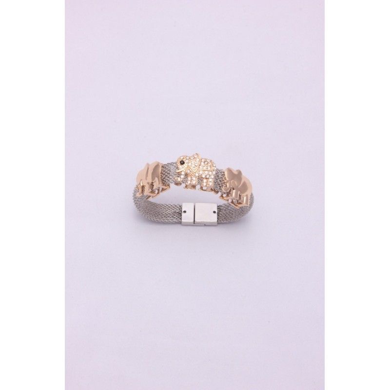Pulsera de malla en color plata con elefantes en color dorado con strass. Cierre de imán. Diámetro aproximado 63 milímetros.